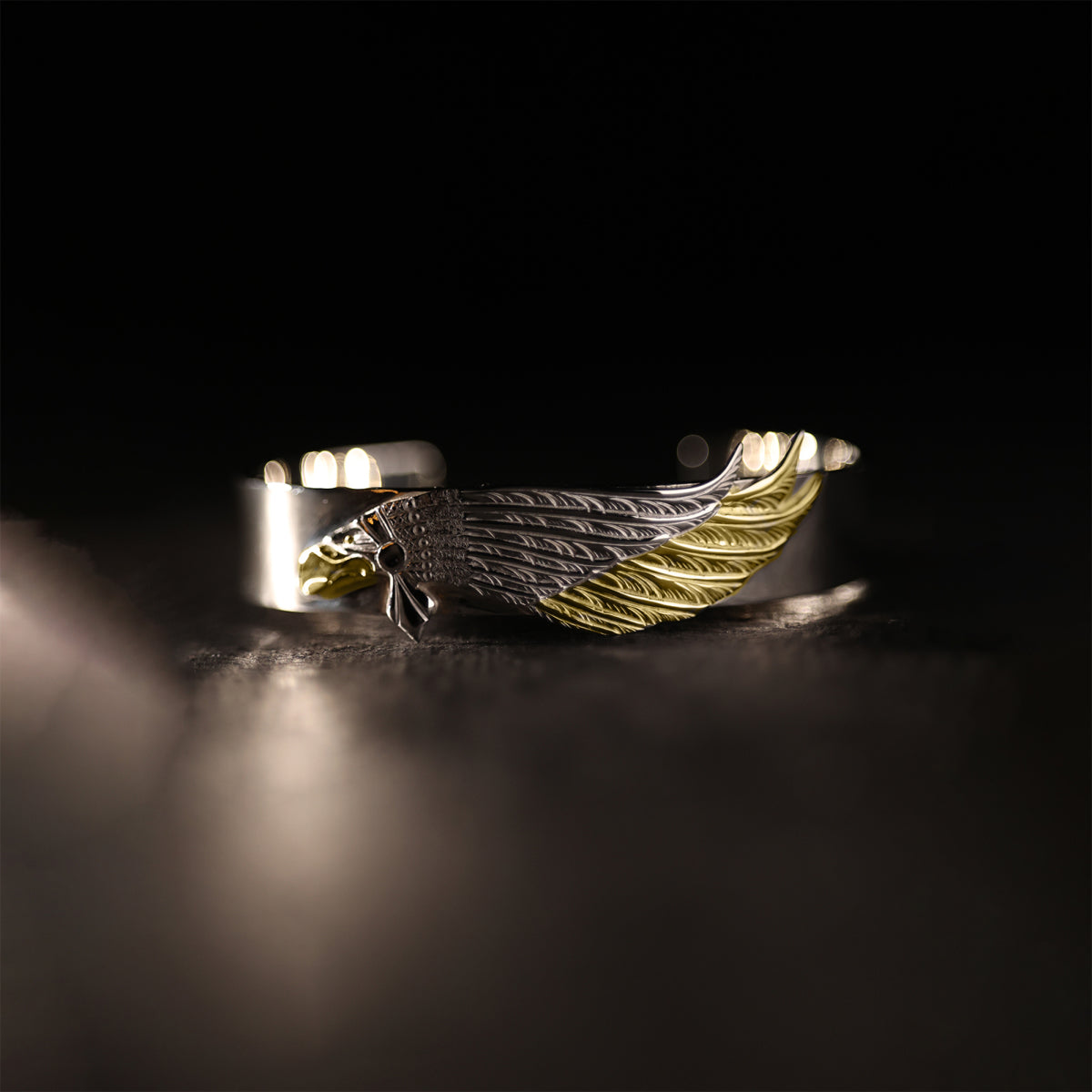 “イーグルインディアン”シングルプレート平打ちバングル 〜口目金×羽金〜 SV×K18 TYPE 雌鷲モデル 12mm 左腕用