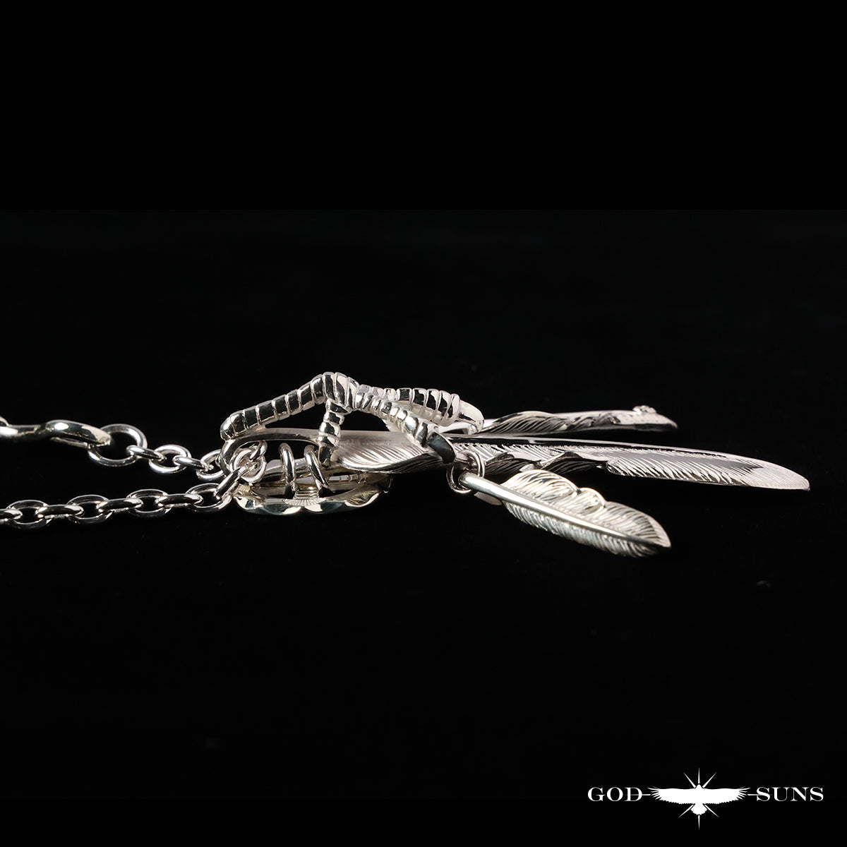 GODSUNS の大人気定番アイテムの爪フェザーを丸カンとフェザーを使用して3点吊りへとカスタムアップ。Silverのアイテムは着用と共に自然硫化していくことで風合いが変わり、鈍く光り独特のオーラを放つ様になっていきます。所有者それぞれの着用の仕方やライフスタイルによって独自の硫化をしていく過程を楽しむのがネイティブジュエリーの醍醐味でもあります。何かと新しいスタートを切ることの多いこの季節、真新しいカスタムと共に思い思いの成長を歩んで欲しいという意味を込めて作ったAll silverのカスタムセットとなっています。