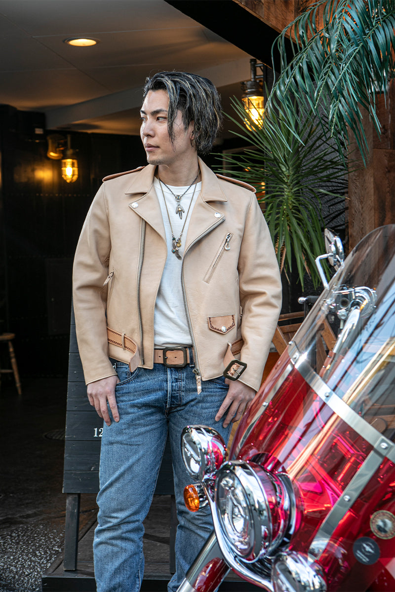 コラボダブルライダースのノーマルモデル・ベージュバージョンは、アメカジスタイルの大本命。