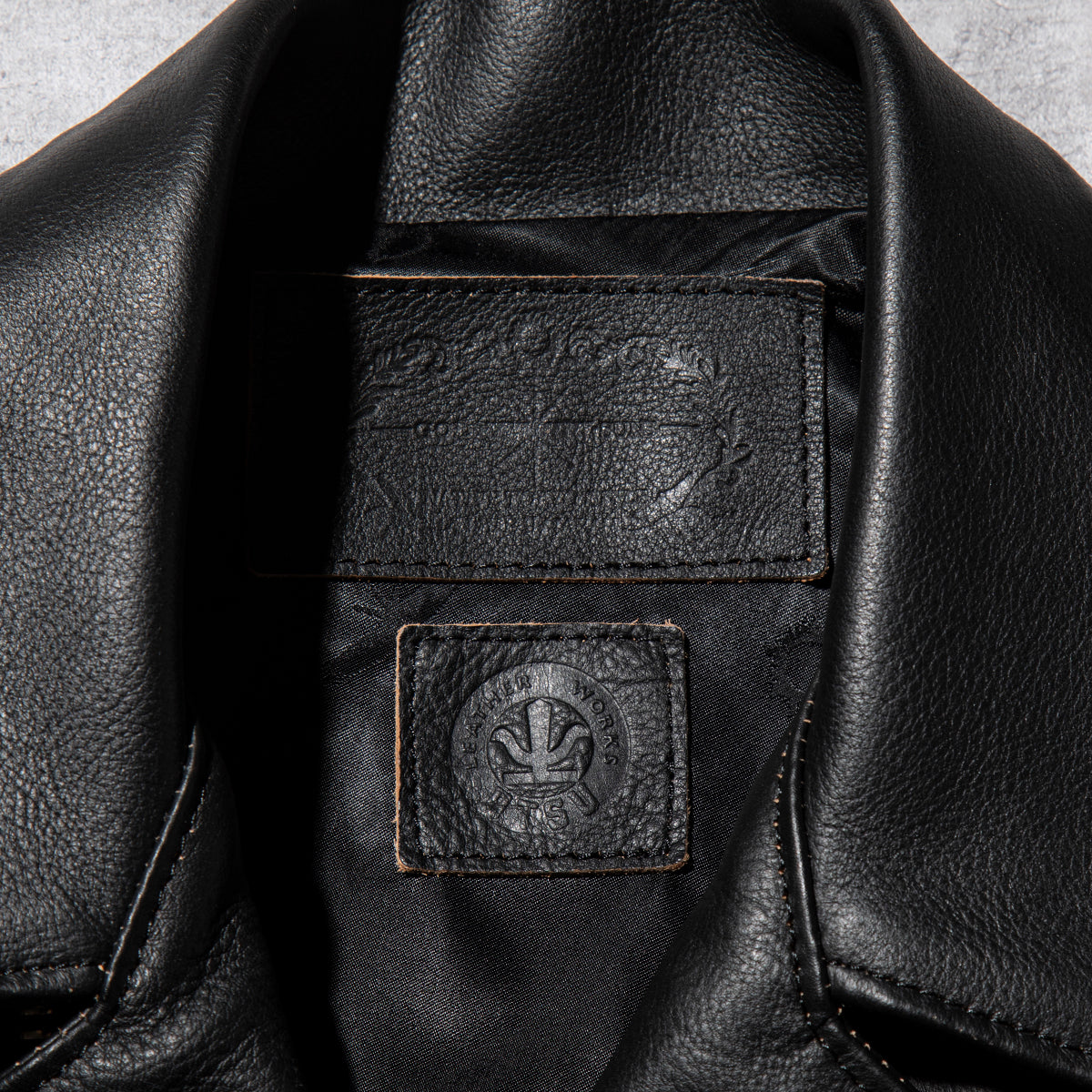 裏地は最高級のジャガード生地を使用し、光沢感から艶とハリを兼ね備えた着心地の良い生地を採用。首元にはダブルネームのレザータグを、左右の裏レザーポケットにもそれぞれのブランドロゴが刻印されている。リベットもYKK×GODSUNSのオリジナルデザイン仕様と細部まで拘ったジャケットとなる。