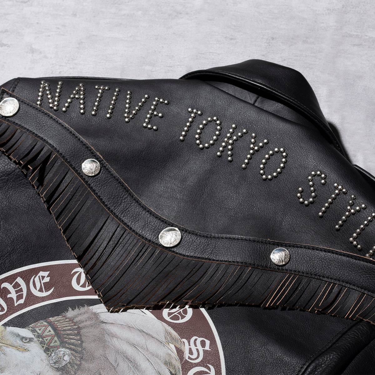 背面にはGOD SUNS〈ゴッド サンズ〉デザイナー・YASUYUKI YODA氏が手がけた イーグルインディアンのグラフィックをプリント加工で刻印するなど、圧巻の存在感を見せてくれる。また業界初となるGOD SUNS発案の"脱着式フリンジ"も最大の見所の一つだ。東京カルチャーとして発信するネイティブスタイルをテーマにした"NATIVE TOKYO STYLE"の文字も一つ一つ丁寧にスタッズで打ち込むといった豪華仕様で演出。そしてエポレット、フロントポケット、左右ベルトに施されたサンバーストと、アメリカンローズ&唐草のカービングは〈ATSU LEATHER WORKS(アツ レザーワークス)〉を率いるATSUSHI TOYAMA氏が担当。