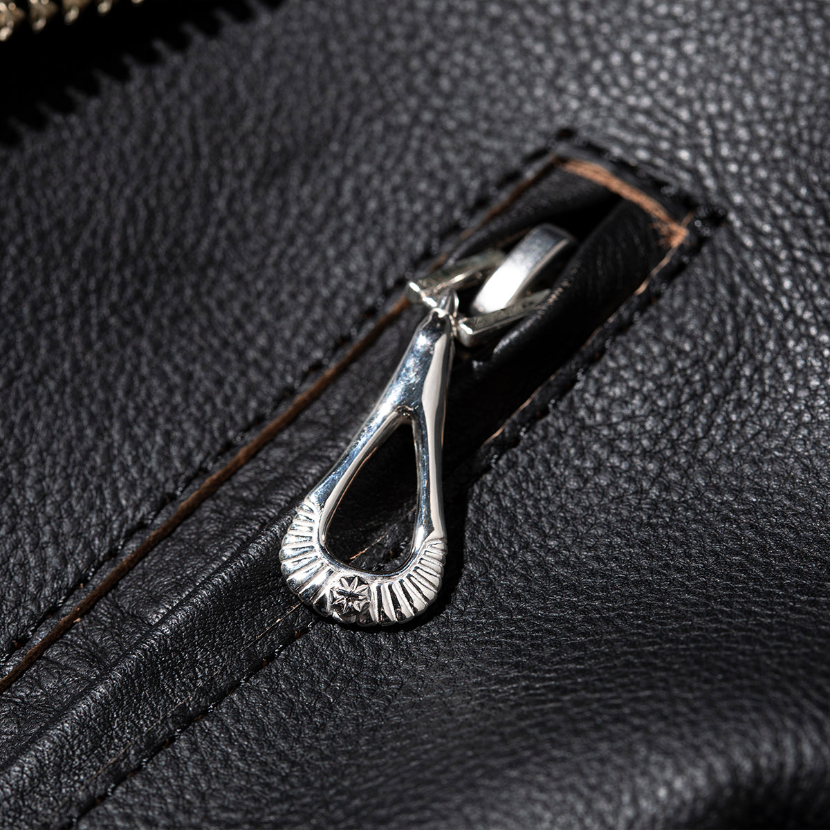 "イーグルインディアン"SV950コインコンチョは豪華にも10個装着。ベージュタイプとは異なり、 胸元のファスナーにはプラチナメタルが入ったイーグル×サンバースト*SV×PTタイプを、フロントファスナーにはブランドロゴの"PTプラチナメタル"を選択。透明感のある輝きを取り入れて、ブラックレザーの美しさをより一層引き立てた。またシルバーパーツ、バックルも全て簡単に取り外せるため、ゆくゆく貴方のお好みに合わせたシルバーパーツへ自由にアレンジ可能だ。