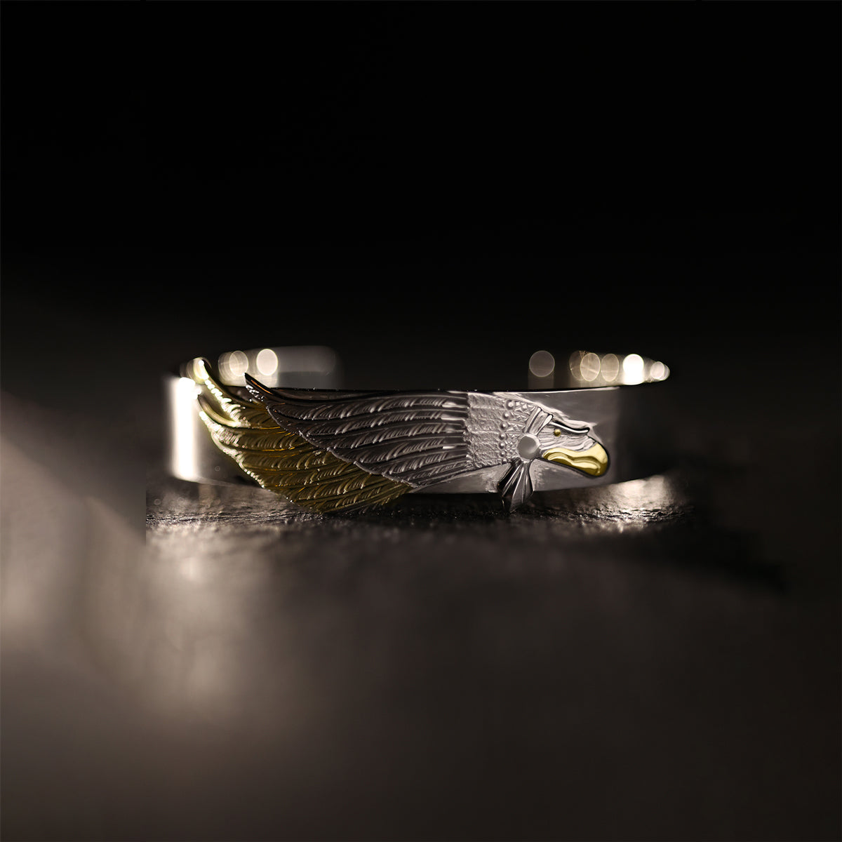 こちらは“イーグルインディアン”シングルプレート平打ちバングル 〜口目金×羽金〜 SV×K18 TYPE 雄鷲モデル 12mm 右腕用のみの販売になります。